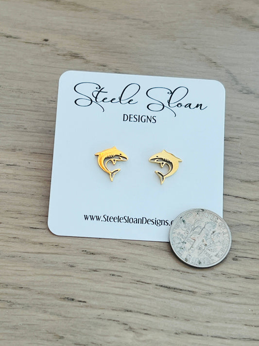 Go Sharks! Cute Shark Gold Stud Earrings - Shark Gift