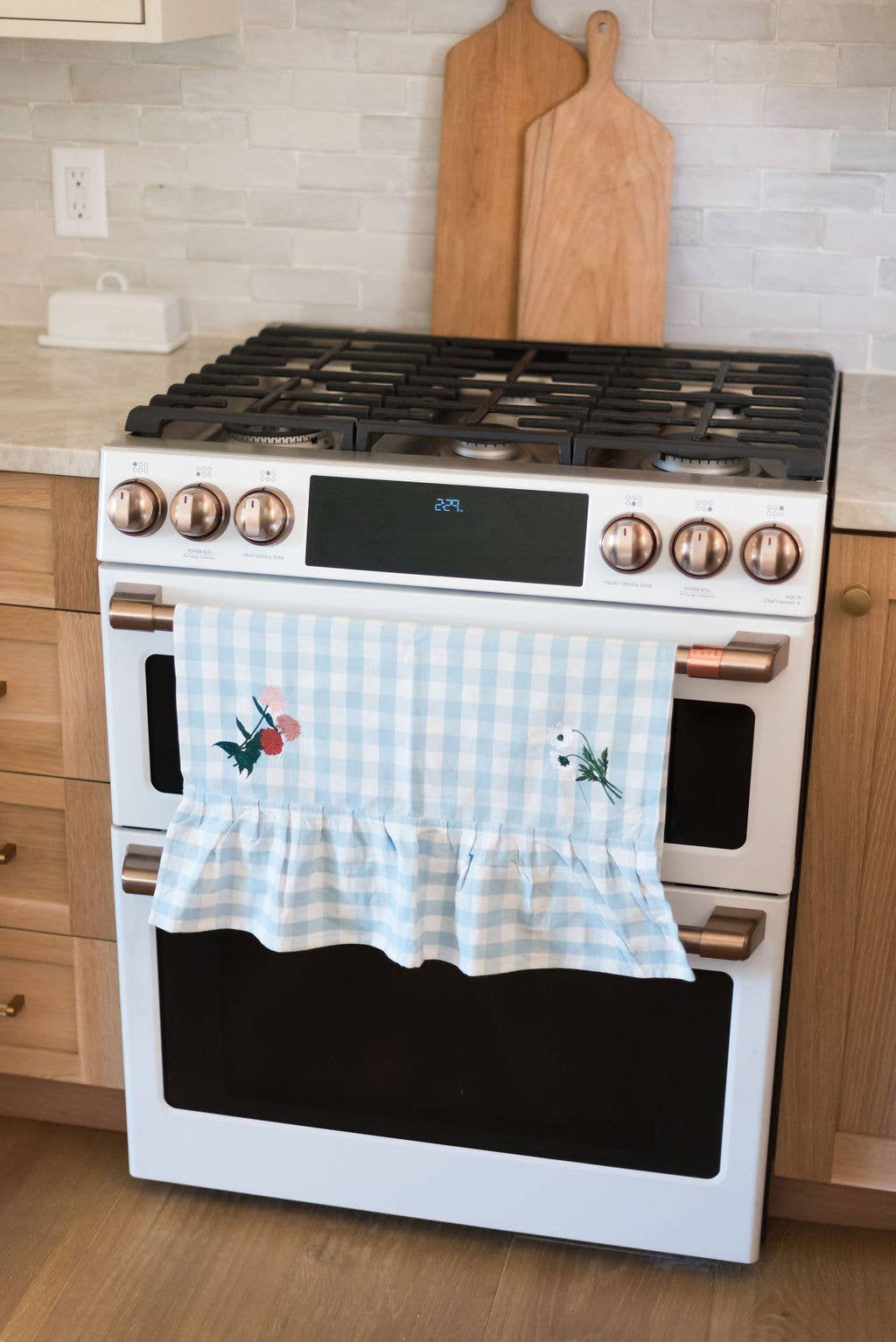 Our uniquely designed dish towel is made from high quality 100% cotton. This European inspired towel is perfect for bringing some pattern and color to the room. Our dish towel features a timeless blue and white gingham pattern, a flirty ruffle, a heavy weave, and two embroidered flowers and is machine washable (we recommend washing in cold water and tumble dry or air dry). Dimensions: 18" x 28"