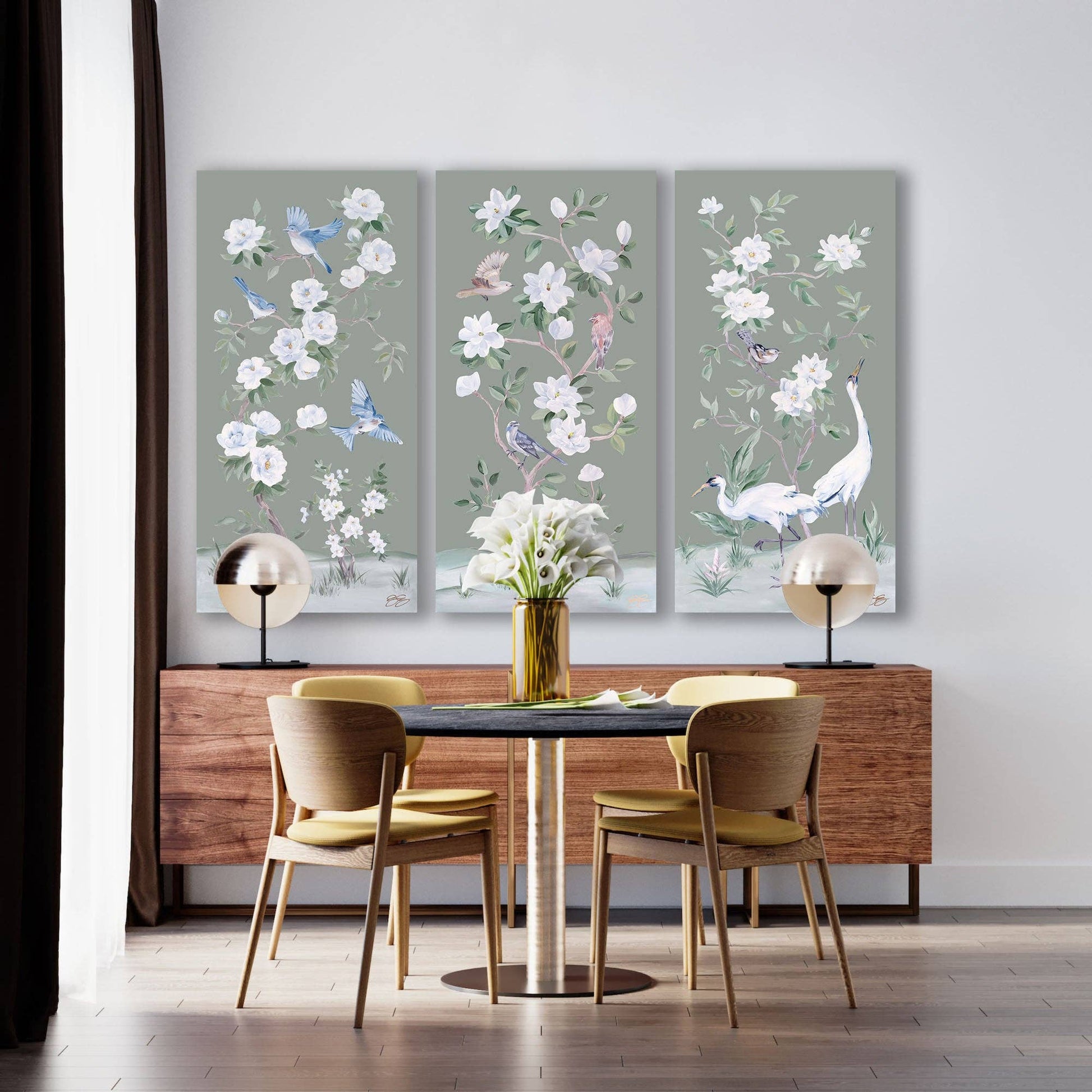 I recommend pairing with "Cranes and Gardenias" and/or "Songbirds and Magnolias" for a set of two or three panels.