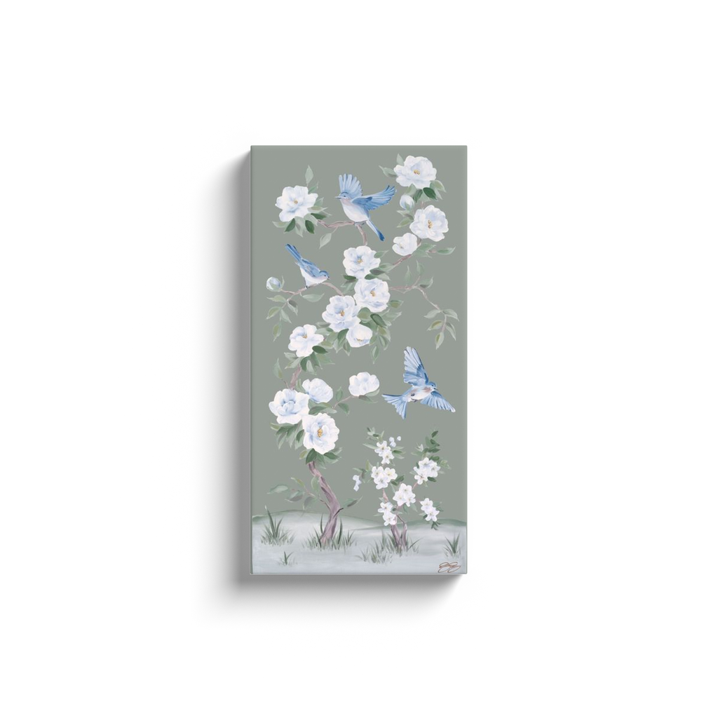 Bluebirds and Peonies, a green chinoiserie canvas wrap: 15x30 inch