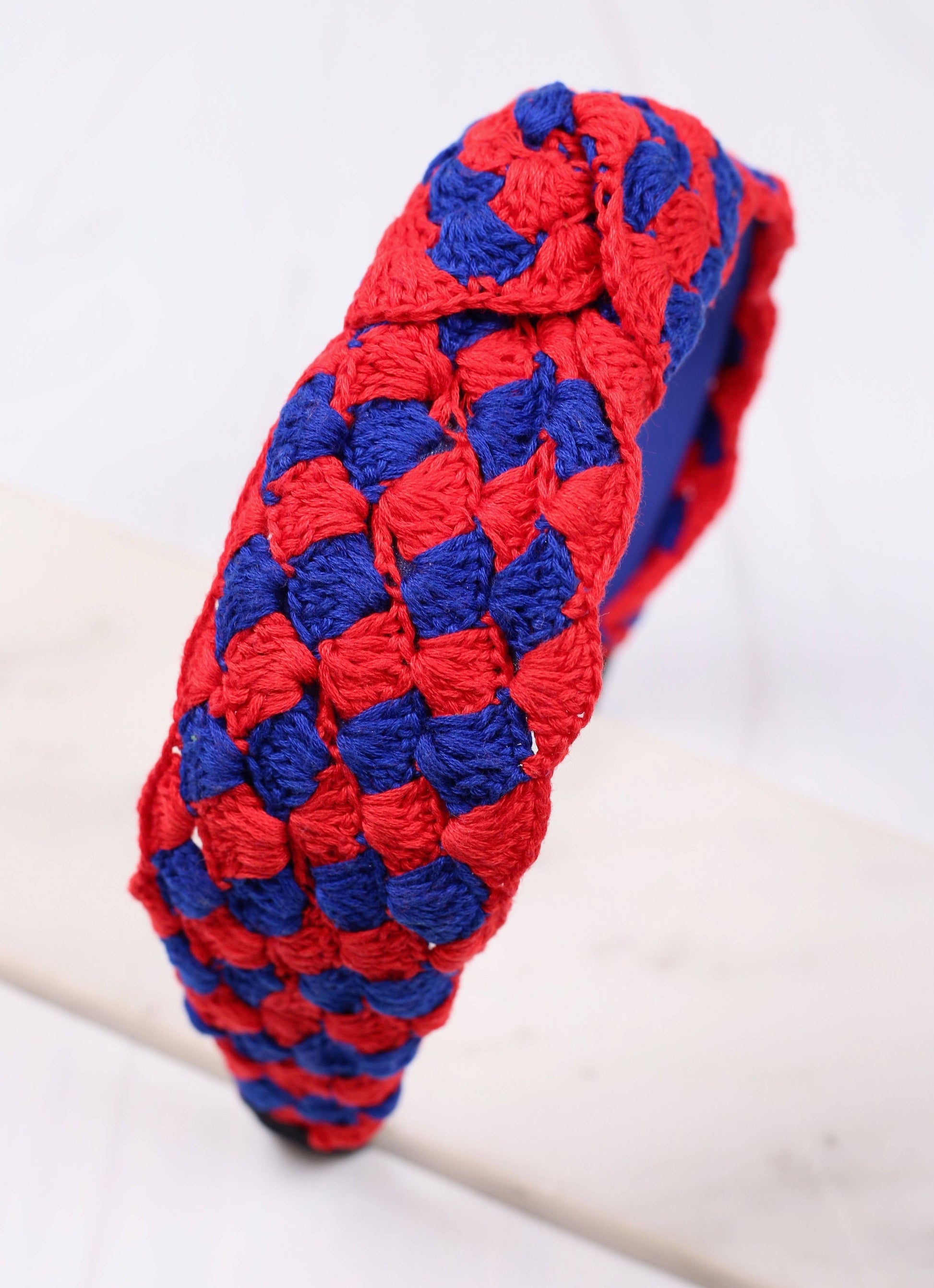 This soft, crochet headband has a two tone pattern with a top knot accent. A wonderful pick to support your team on Game Day!