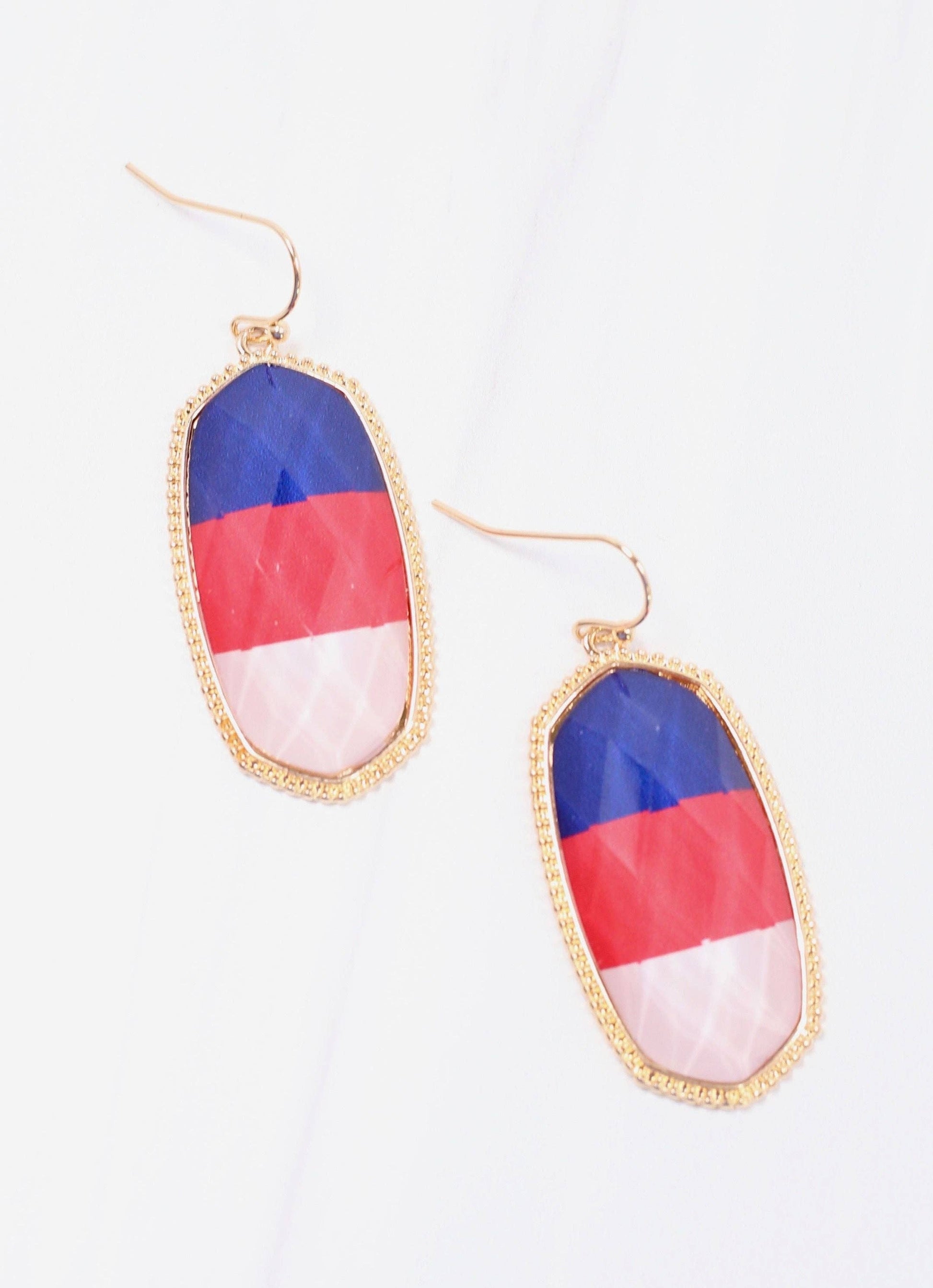 This drop earring features blue, red, and white with a faceted stone overlay. It is set in gold and on a fish hook back.