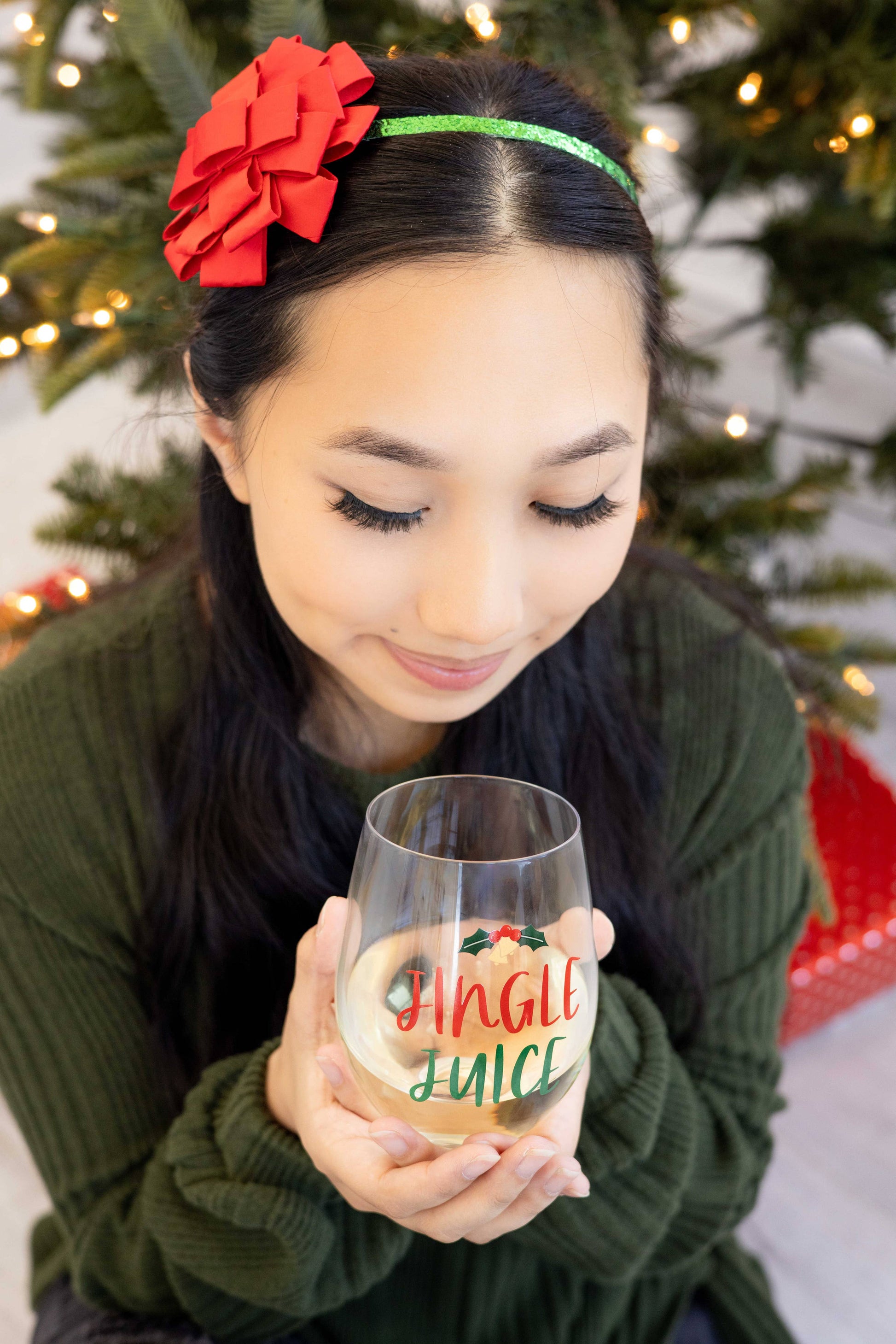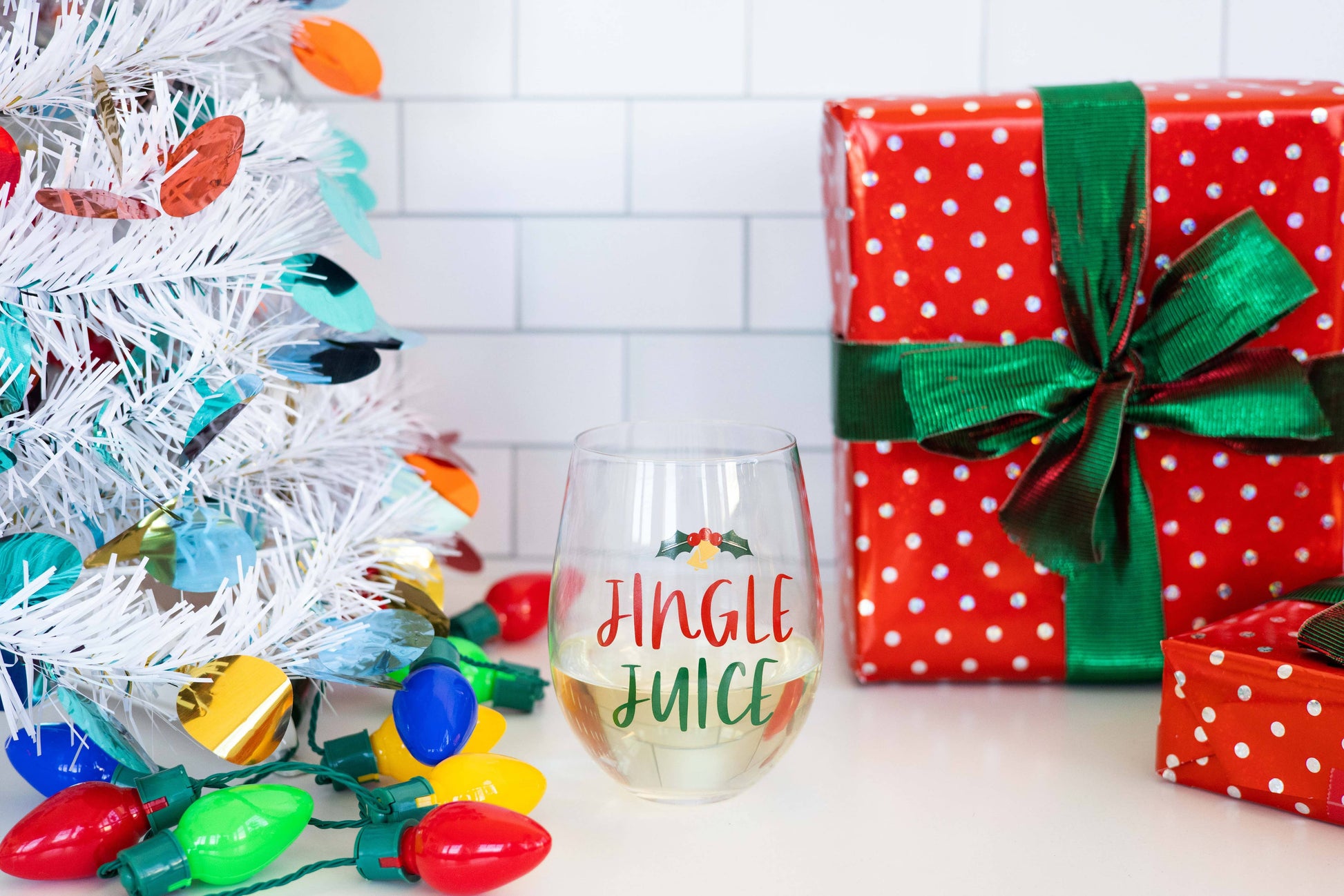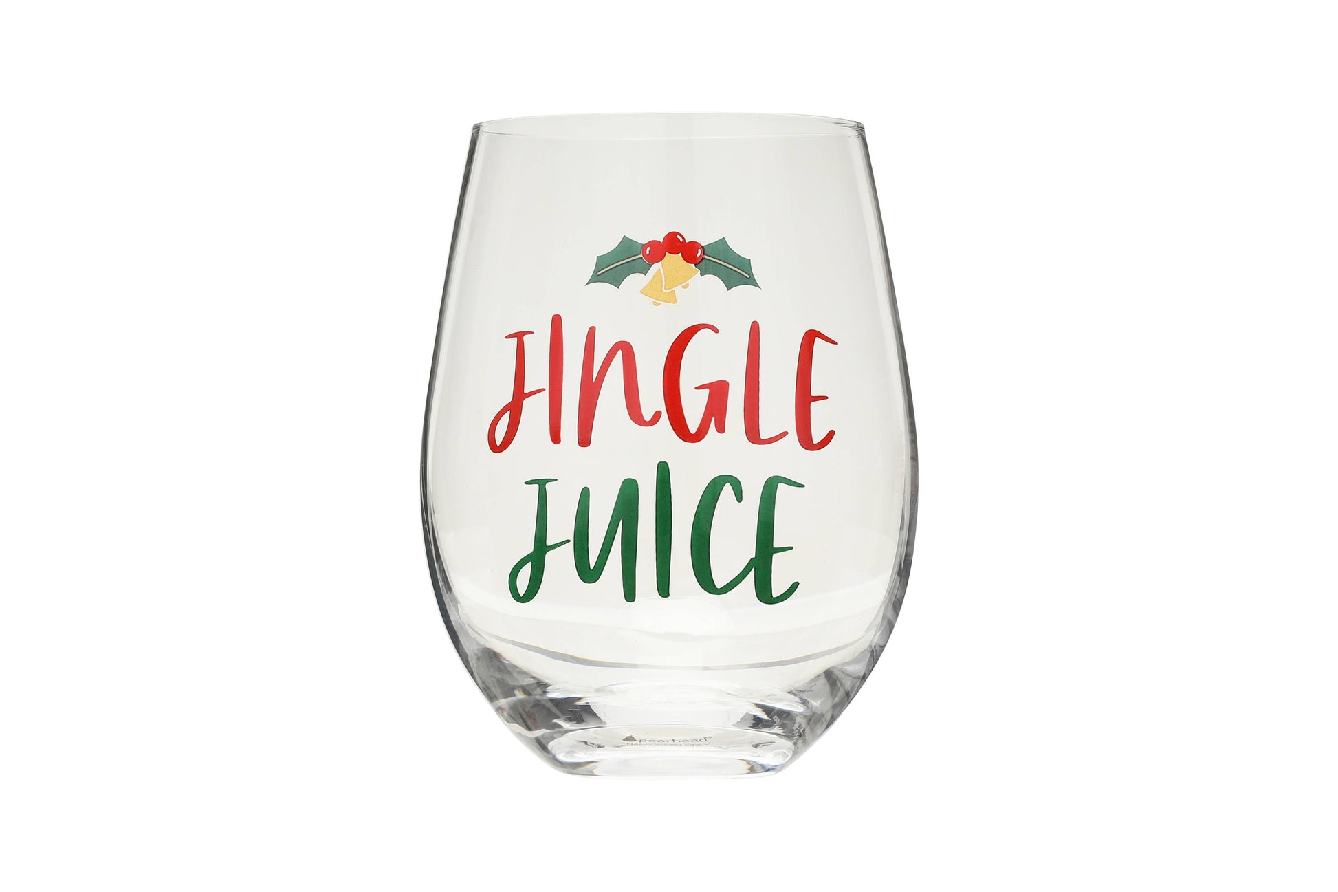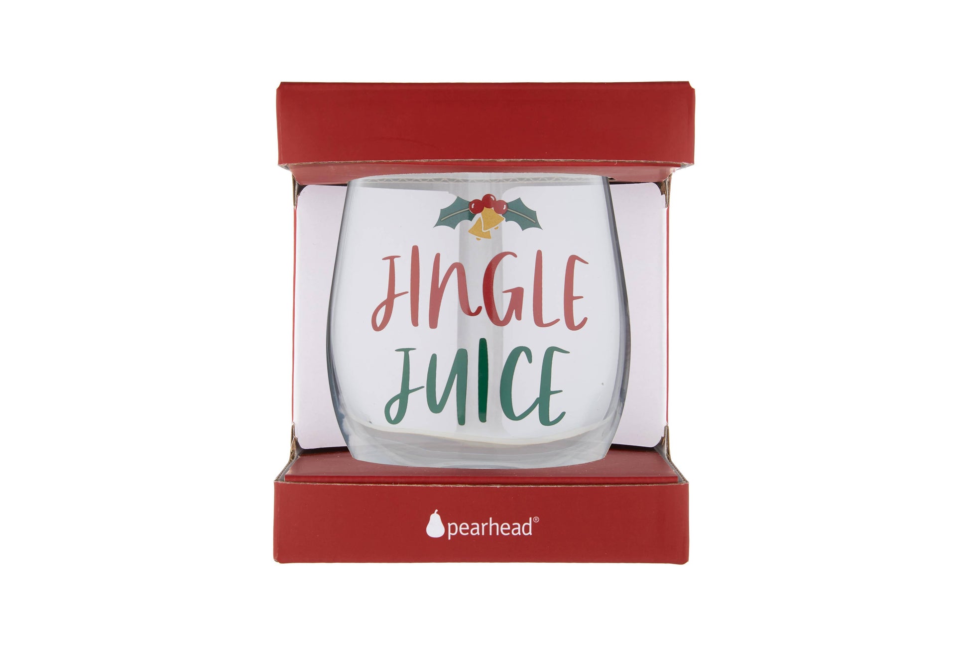 • Includes one stemless wine glass decorated with the words “jingle juice” in a festive red and green print and a set of holiday bells and holly