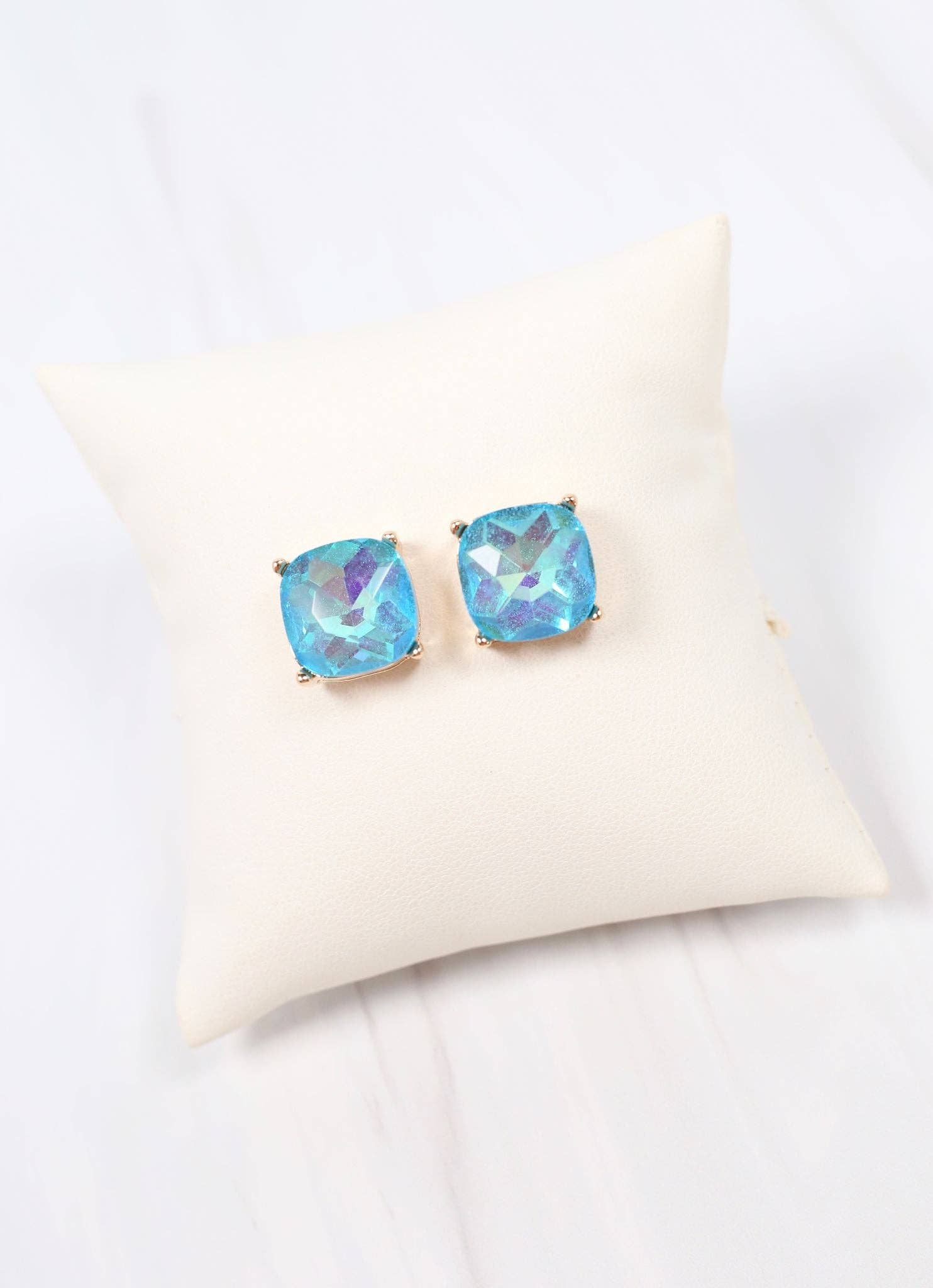 This beautiful stud earring has a faceted, cushion cut stone set in gold. It's a great size and color for everyday wear or to dress up an outfit.