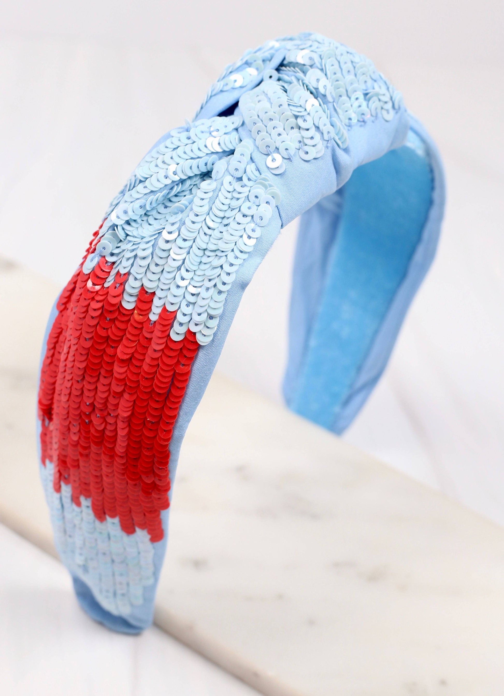 Get ready to cheer on your team with this embellished headband! It features two tone sequins of powder blue and red with an accent top knot. The interior is lined with a microfiber-feel material for extra softness.