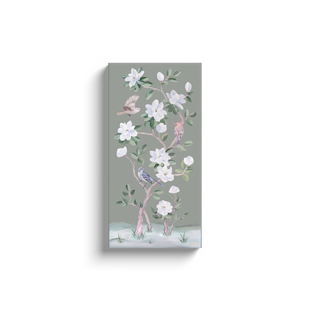 Songbirds and Magnolias, a green chinoiserie canvas wrap: 15x30 inch