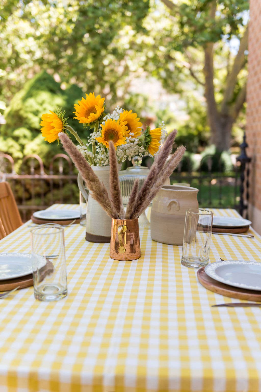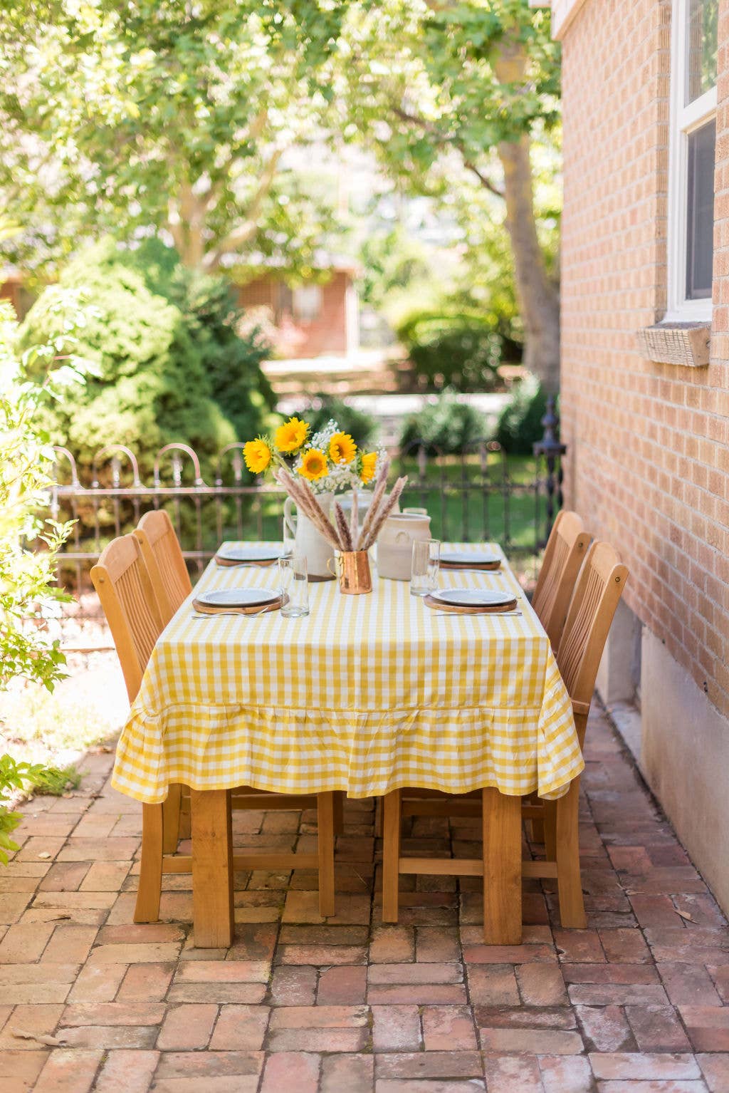 Our uniquely designed tablecloth is made from high quality 100% cotton. This European inspired tablecloth is perfect for casual dinners to formal occasions and weddings. Our tablecloth features a timeless yellow and white gingham pattern, a flirty ruffle, a heavy weave and is machine washable (we recommend washing in cold water and tumble dry or air dry). Our rectangular tablecloth comes in three different sizes: 60" x 60", 60" x 90" and 60" x 120". These sizes will work with most standard square and rectangular dining tables. Whether you are wanting a formal table spread or simply a casual setting, these linen tablecloths are just the thing.