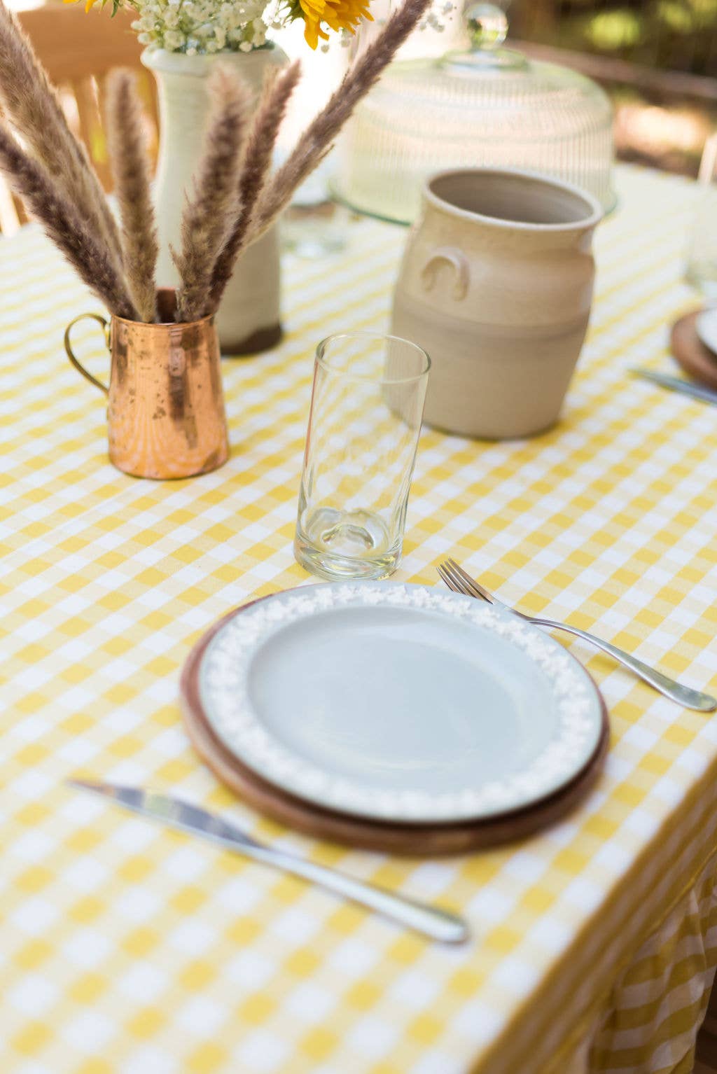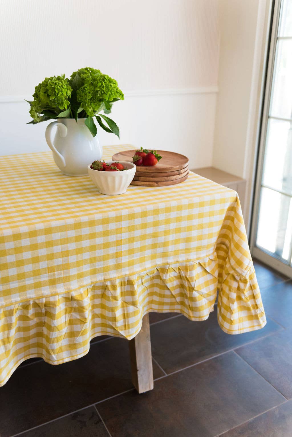 Our uniquely designed tablecloth is made from high quality 100% cotton. This European inspired tablecloth is perfect for casual dinners to formal occasions and weddings. Our tablecloth features a timeless yellow and white gingham pattern, a flirty ruffle, a heavy weave and is machine washable (we recommend washing in cold water and tumble dry or air dry). Our rectangular tablecloth comes in three different sizes: 60" x 60", 60" x 90" and 60" x 120". These sizes will work with most standard square and rectangular dining tables. Whether you are wanting a formal table spread or simply a casual setting, these linen tablecloths are just the thing.
